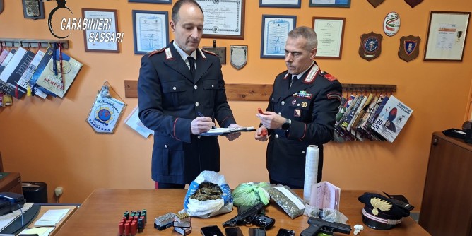 ITTIRI - Nella mattinata di martedì 13 gennaio, a Ittiri, i Carabinieri della locale Stazione, con il supporto dei colleghi dello Squadrone Eliportato Cacciatori Sardegna, del Nucleo Operativo e Radiomobile della Compagnia di Alghero e della Stazione Carabinieri di Romana, hanno arrestato in flagranza di reato due giovani poiché resisi responsabili dei reati di detenzione ai fini di spaccio di sostanze stupefacenti e detenzione abusiva di armi. In particolare i militari dell’Arma, a seguito di una rapida attività d’indagine, hanno effettuato un’approfondita perquisizione domiciliare presso le abitazioni in uso ai 2 ragazzi, nel corso delle quali i Carabinieri, anche grazie al prezioso contributo delle unità cinofile specializzate nella ricerca di armi e sostanze stupefacenti, hanno rinvenuto: un fucile “doppietta a cani esterni”; una pistola scacciacani cal. 8, priva di tappo rosso e modificata per l’uso offensivo, con 47 cartucce a salve dello stesso calibro; circa 7 grammi di cocaina; circa 796 grammi complessivi di marijuana; due bilancini elettronici di precisione; vario materiale utilizzato per il confezionamento; 2 coltelli con lama della lunghezza di circa 12 cm; 138 munizioni di diverso calibro; varie parti meccaniche riconducibili ad armi da fuoco; una pistola ad aria compressa calibro 7, priva di tappo rosso. Tutto il materiale è stato sequestrato mentre, ultimate le formalità di rito, gli arrestati, su disposizione della Procura della Repubblica di Sassari che coordina e dirige le indagini, sono stati associati alla Casa Circondariale di Sassari – Bancali, a disposizione dell’Autorità Giudiziaria. L’attività rientra in un più ampio dispositivo di controllo del territorio e di contrasto alla diffusione di armi e sostanze stupefacenti che l’Arma dei Carabinieri continua a svolgere con costanza e attenzione nella provincia di Sassari.
