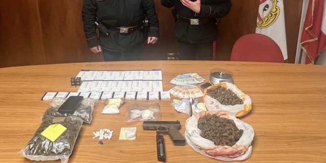 Il giovane è stato trovato in possesso di 158 grammi di cocaina, 655 grammi di marijuana, 25 confezioni di sostanze dopanti vietate, un ordigno artigianale e una pistola a gas