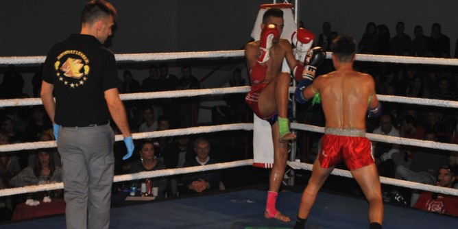 SASSARI – Il titolo italiano juniores di Muay thai resta in Sardegna per squalifica, quello europeo di Mma vola in Olanda mentre il trofeo per il migliore atleta è di un cagliaritano. È il verdetto dell’Explosion extreme XV – quarto trofeo internazionale Franco Muggiolu che sabato, al Pala Simula di via Poligono a Sassari, ha visto salire sul ring le migliori scuole isolane, siciliana e olandese di muay thai e di arti marziali miste (mma – ‘mixed martial arts’). Sedici incontri da alta tensione, con la sessione dedicata al main event che ha scatenato vere e proprie scariche di adrenalina e brividi. In evidenza quindi i due match clou che hanno chiuso la serata del “Muggiolu”, prima quello dedicato alla disciplina thailandese con il palio il titolo italiano juniores quindi di Mma per il prestigioso titolo europeo. A salire per primo sul ring è stato l’idolo di casa, il sedicenne Cristiano Sanna (team Tarantini), già campione italiano juniores Open, opposto al diciassettenne campione regionale siciliano Giovanni D’Amico (team Cosmos del maestro Carmelo Di Pace). Un vero e proprio incontro elettrizzante di muay thai (kg 57) che ha messo duramente alla prova i due giovani atleti. Il match, sulla distanza delle cinque riprese della durata di due minuti, si è giocato tutto nelle prime tre. Il primo round si è chiuso a tutto vantaggio del sassarese e il secondo ha visto Sanna sferrare una lunga serie di calci andati a segno e controllare l’avversario.
