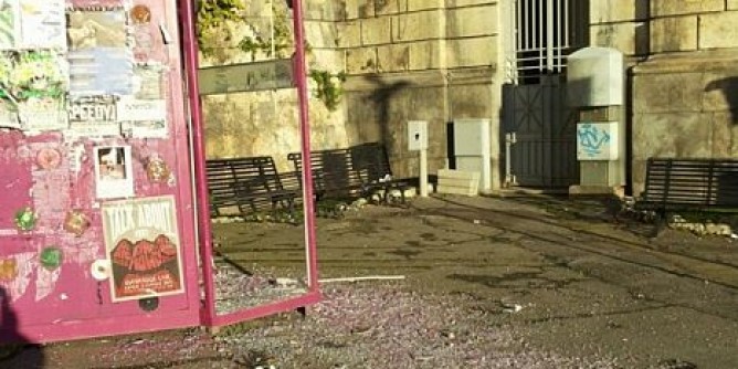 Nella foto la cabina telefonica distrutta in Piazza Costituzione